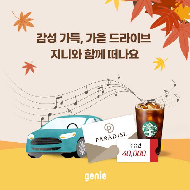지니뮤직은 가을을 맞아 운전자의 다양한 음악 감상 경험을 공유하는 프로모션 ‘가을 드라이브, 지니뮤직과 함께 감성 UP!’을 11월 12일까지 개최한다. 이 프로모션에서는 가을 감성을 더해줄 추천 음악 20곡을 담은 플레이리스트를 공개하며, 자동차에서 음악을 감상하는 나만의 방법과 지니 서비스 이용 후기를 모집한다. 참여자들 중 추첨을 통해 호텔 숙박권, 주유권, 커피 쿠폰도 제공할 예정이다.