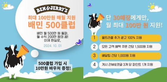 월 100만원 지원하는 배민500클럽 공지 (세컨드유레카 제공)