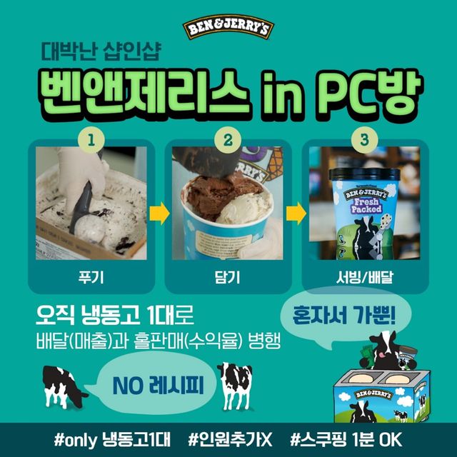 성중헌: 벤앤제리스 배달전문점 창업이 괜찮은 게, 샵인샵 개념이라 망할 게 없어요. 기존에 배달하던 점주가 자투리 공간에 냉동고 하나 놓으면 끝이에요. 레시피나 기술도 전혀 필요 없어요. 배스킨라빈스도 그렇듯, 냉동고에서 아이스크림 퍼담고, 그걸 보냉팩에 넣어 배달원 전달하면 끝이죠. 그러다 기존에 하던 치킨집이 망했다? 그때도 공짜로 받은 냉동고만 저희 쪽에 반납하면 끝입니다. 손해 볼 거 없이 수익만 늘어나는 구조니 잘 될 수밖에 없었죠. 이제 편의점 등으로 이름이 점점 알려지니 로드샵 가맹 문의도 많이 들어와서, 오프라인으로도 진출할 계획입니다.