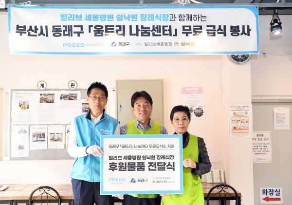 [파이낸셜경제=김영란 기자] 부산 동래구는 지난 29일 ㈜프리드라이프(대표이사 김만기) 전문장례식장 브랜드‘빌리브세웅병원 쉴낙원’장례식장에서 온천동 소재 무료 급식소인 (사)움트리나눔센터(대표 김양애)에 무료급식 봉사활동 및 성품을 전달했다고 밝혔다.