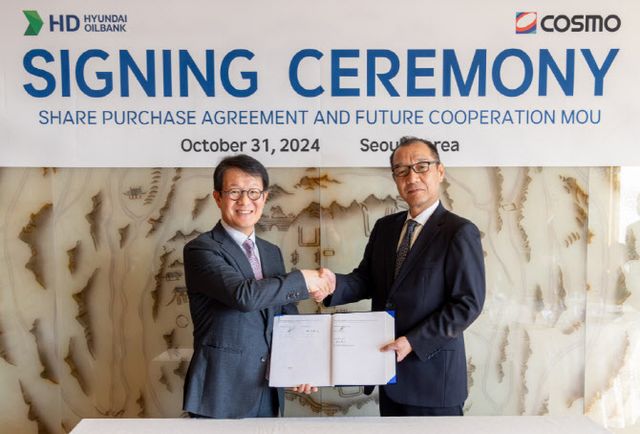 HD현대오일뱅크는 이번 지분 인수 계약과 함께 日코스모오일과 ‘미래 신사업 협력 MOU’도 체결해 양사 간 협력 관계를 지속적으로 이어갈 예정이다. 업무 협약에는 SAF(지속가능항공유), 순환 납사, 열분해 유 등의 미래 에너지 사업과 윤활유, CCUS(탄소 포집·저장·활용) 등의 분야에서 상호 긴밀히 협력하는 내용이 담겼다.
