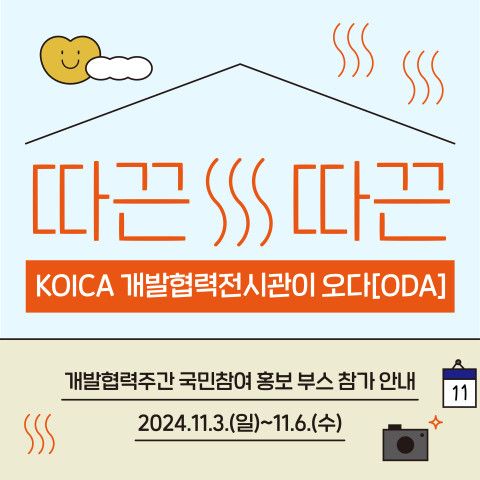 이에 앞서 11월 3일~6일에는 서울 광화문 광장에서 국내 ODA 시행기관을 비롯해 관련 시민사회·기업·국제기구 등이 참가하는 ‘국민참여 홍보부스’도 운영한다. 코이카는 ‘따끈따끈 코이카 개발협력전시관이 오다(ODA)’라는 주제로 홍보부스를 꾸려 제로웨이스트 따끈따끈 손난로 만들기, 영수증 사진 속 5p* 찾기 등의 체험을 운영한다. SNS 홍보 이벤트와 코이카 개발협력전시관 리플릿 및 세계시민교육 교재도 배포할 예정이다.