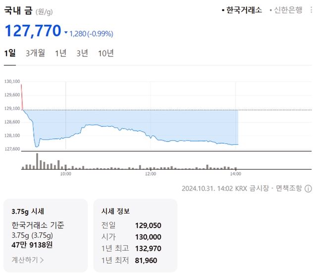 국내 금시세(금값)가 31일 오후 하락세(전 거래일 대비)를 보이고 있다.
