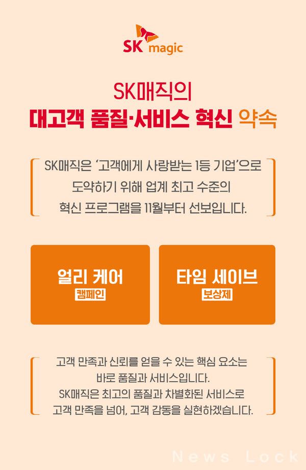 [뉴스락] SK매직(대표 김완성)이 ‘대고객 품질∙서비스 혁신 약속’ 경영 전략을 공표고 이를 실천하기 위한 품질∙서비스 혁신 프로그램을 내달 1일부터 도입한다고 31일 밝혔다.