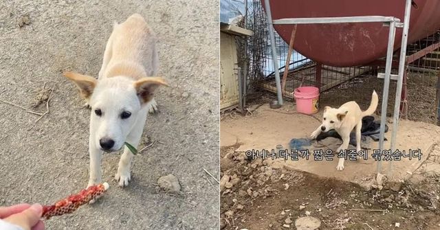 비닐하우스 앞에 묶여 있는 뭉치 / 뭉치 입양 홍보 인스타그램
