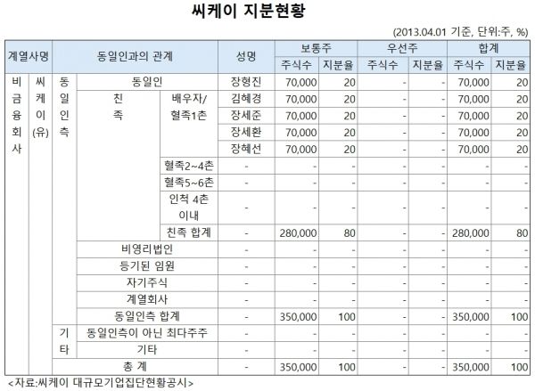 그런데 장 고문의 발언은 사실과 다르다. 감사보고서에 따르면 씨케이는 부동산매매업을 목적으로 2012년 설립됐다. 지분율은 2013년 대규모기업집단현황공시를 통해 처음공개 됐는데 그해 4월 기준 장 고문이 20%, 그리고 배우자인 김혜경씨와 자녀들인 장남 장세준 코리아써키트 부회장, 차남 장세환 전 서린상사 대표, 장녀 장혜선씨 등이 각각 20%씩 보유하고 있었다.