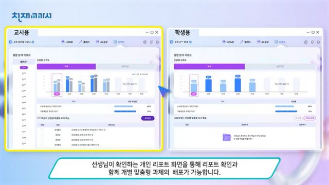 AI가 미리 선별한 단원별 추가 학습 목록 중 원하는 목록을 선택하여 배포할 수 있고, 이를 통해 각 학생에게 필요한 맞춤형 학습 과제를 제공할 수 있다. 이때 학생의 과제 제출 현황은 교사의 AI 코스웨어로 전송되며, 학습진도율과 학습일 등 실시간 학습 현황이 제공되기도 한다. 학생의 특성에 맞는 최적화된 학습 자료로 능동적인 참여를 유도하여 궁극적으로는 성취도를 높이는 데 기여할 예정이다.