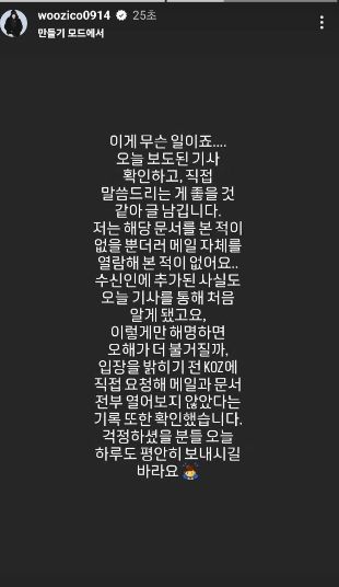 지코는 30일 자신의 인스타그램에 "이게 무슨 일이죠"라는 글과 함께 시작하며, "오늘 보도된 기사를 확인하고 직접 말씀드리는 게 좋을 것 같아 글을 남긴다"고 말문을 열었다. 그는 "저는 해당 문서를 본 적이 없다. 그뿐만 아니라 메일 자체를 열람한 적이 없다"라며, 하이브 내부 문건에 대한 보도 내용과 본인은 전혀 관련이 없음을 분명히 했다.