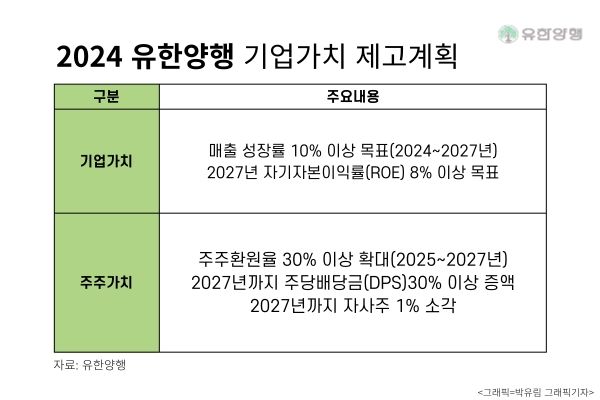 유한양행은 기업가치 제고를 위해 2027년까지 매출액 연평균 성장률(CAGR)을 10% 이상으로 끌어올릴 계획이다. 2027년에는 자기자본이익률(ROE)도 8% 이상 달성하겠다는 목표다.