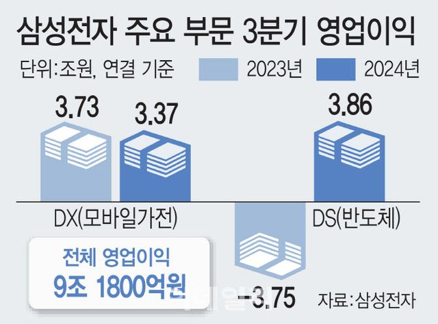 DS 부문 영업이익은 3조8600억원에 그쳤다. 다만 메모리 영업이익은 7조원 수준으로 추정된다. 재고평가손 환입 규모 축소 등 일회성 비용에 파운드리·시스템LSI 사업부 적자를 감안하면 메모리에선 선방했다는 평가다. 차세대 DDR5 D램과 GDDR 판매가 늘었고 HBM 매출도 증가했다. 3분기 HBM 매출은 2분기보다 70% 뛰었다.
