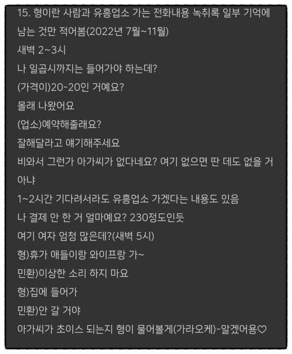이와 함께 율희는 최민환의 지난 2022년 당시 음성이 담긴 녹취록을 공개했다. 녹취록에 따르면 최민환은 "형 어디 놀러 가고 싶은데 갈 데 있나? 거기에 아가씨가 없다고 한다" "거기는 주대가 어떻게 되나" "금액 텔레그램으로 보내줄 수 있나" "형이 가서 아가씨 초이스 되는지 물어봐 달라" "근처 호텔 갈 데 있나? 모텔도 상관없다" 등 발언을 했다.