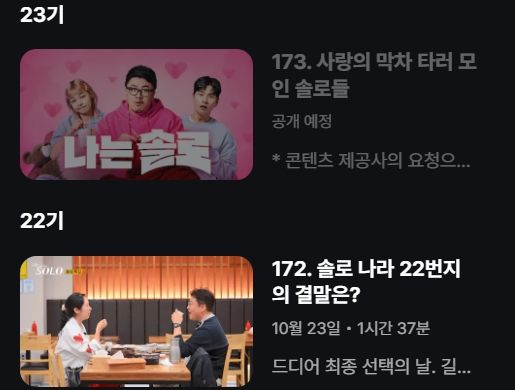 그런 가운데 OTT 쿠팡플레이에서는 23기 '사랑의 막차 타러 모인 솔로들' 에피소드가 콘텐츠 제공사의 요청으로 다시보기 서비스가 중단돼 눈길을 끌었다.