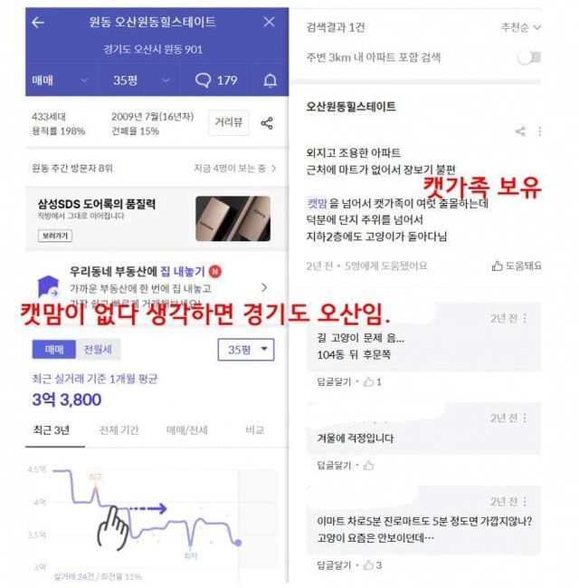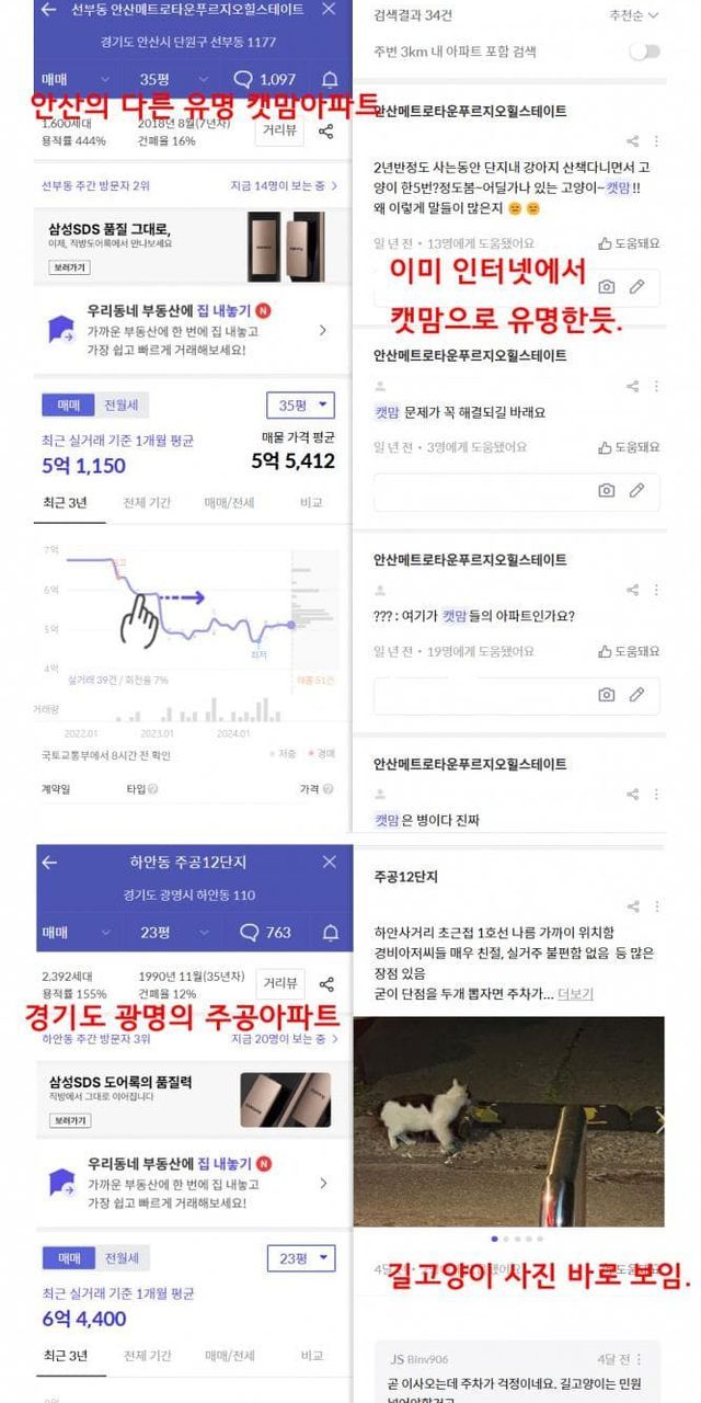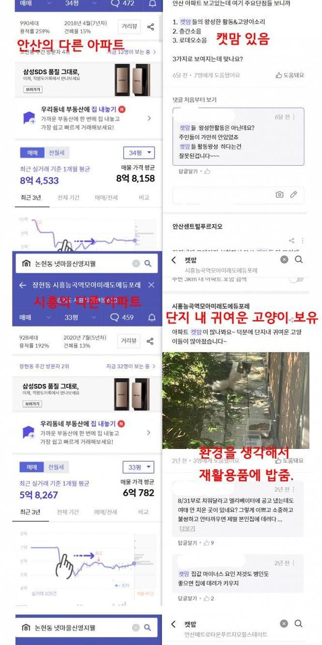 아래 사진은 부동산 앱으로 아파트 검색했을때 나오는 캣맘 관련 내용들임