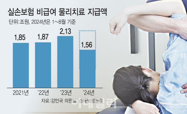 31일 손해보험협회가 국회 정무위원회 소속 강민국 국민의힘 의원에게 제출한 자료에 따르면 올 들어 지난 8월까지 도수치료·체외충격파치료·증식치료 등 비급여 물리치료로 지급된 실손보험금은 1조 5620억원(784만건)으로 집계됐다. 연도별로 살펴보면 2021년 1조 8468억원(936만 2000건, 2022년 1조 8692억원(986만건), 작년 2조 1270억원(1152만건)으로 매년 규모가 커지고 있다.