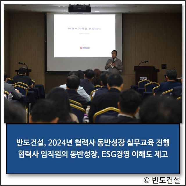반도건설이 '협력사의 ESG 경영 역량 강화를 통한 동반성장 문화 확산과 협력사 간 상생과 안전 문화 증진'을 위해 한국과학기술회관에서 동반성장위원회와 협력하여 협력사를 대상으로 한 '2024년 협력사 동반성장 실무교육'을 진행했다.