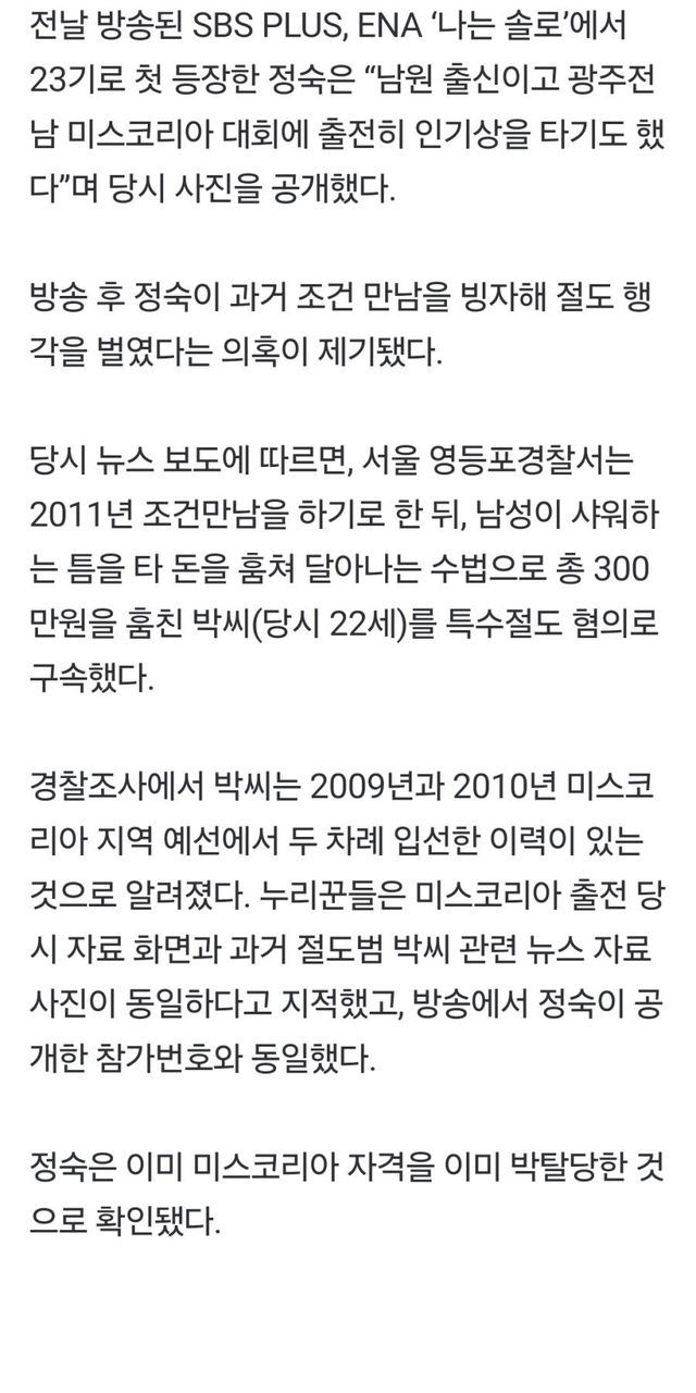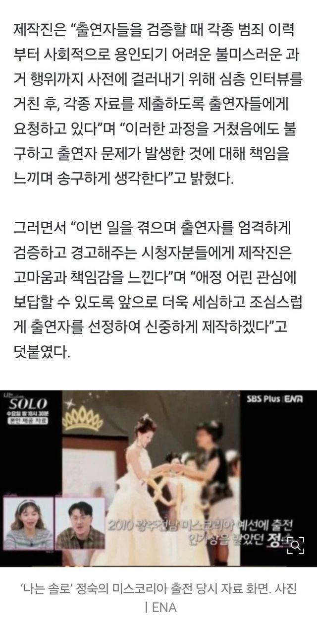 ‘전과 논란’ 23기 정숙, 통편집…제작진 사과