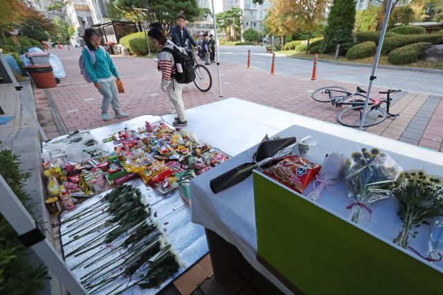 사고 현장에는 B양을 추모하기 위한 공간이 마련돼 국화와 과자 등이 놓였다. B양 또래 아이들은 초콜릿, 젤리 등을 손에 쥐고 추모 공간을 찾았고 “친구야 아프지 마”라는 등 추모 메시지를 남겼다.