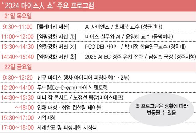 행사 첫날인 21일 플래너리 세션 강연은 ‘AI 사피엔스’를 주제로 최재붕 성균관대 교수가 맡는다. 이어지는 마이스 역량강화 세션은 윤영혜 동덕여대 교수의 ‘마이스 실무와 AI’에 이어 박미정 경희대 학술연구교수가 ‘DEI’(다양성·형평성·포용성)를 주제로 강연 무대에 오른다. 남심숙 경주시청 문화관광국장은 이번 행사에서 치열한 경쟁을 뚫고 ‘2025 아시아태평양경제협력체(APEC) 정상회의’ 유치에 성공한 경주시의 국제회의 유치 전략과 비결을 공개한다.