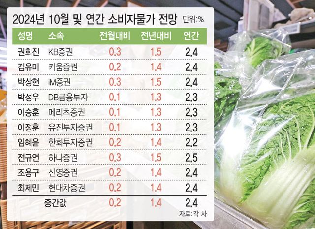 박성우 DB금융투자 연구위원은 “11월과 12월, 내년 1월, 2월 계속 1% 후반대가 나올 것”이라며 “유가가 비교적 안정권에 들어가는 등 물가가 올라갈 요인보다 떨어질 요인이 더 많다”고 분석했다. 박상현 iM증권 전문위원도 “10월보다는 조금씩 물가가 올라가겠지만, 2%대 이하의 흐름은 계속해서 유지될 것으로 보고 있다”고 내다봤다.
