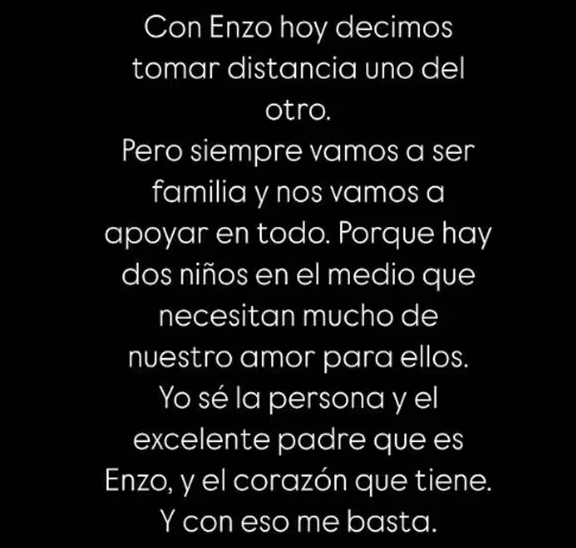 매체에 따르면 세르반테스는 엔소와의 관계에 대해 "우리는 항상 가족일 것이고, 모든 일에서 서로를 지지할 것이다. 우리에게서 많은 사랑이 필요한 두 자녀가 있기 때문"이라며 "난 엔소가 어떤 사람인지, 그가 얼마나 훌륭한 아버지인지 그가 가진 마음을 알고 있다. 그것만으로도 충분하다. 갈등이 없는 곳에서 갈등을 만들려고 하지 마라"라고 밝혔다.