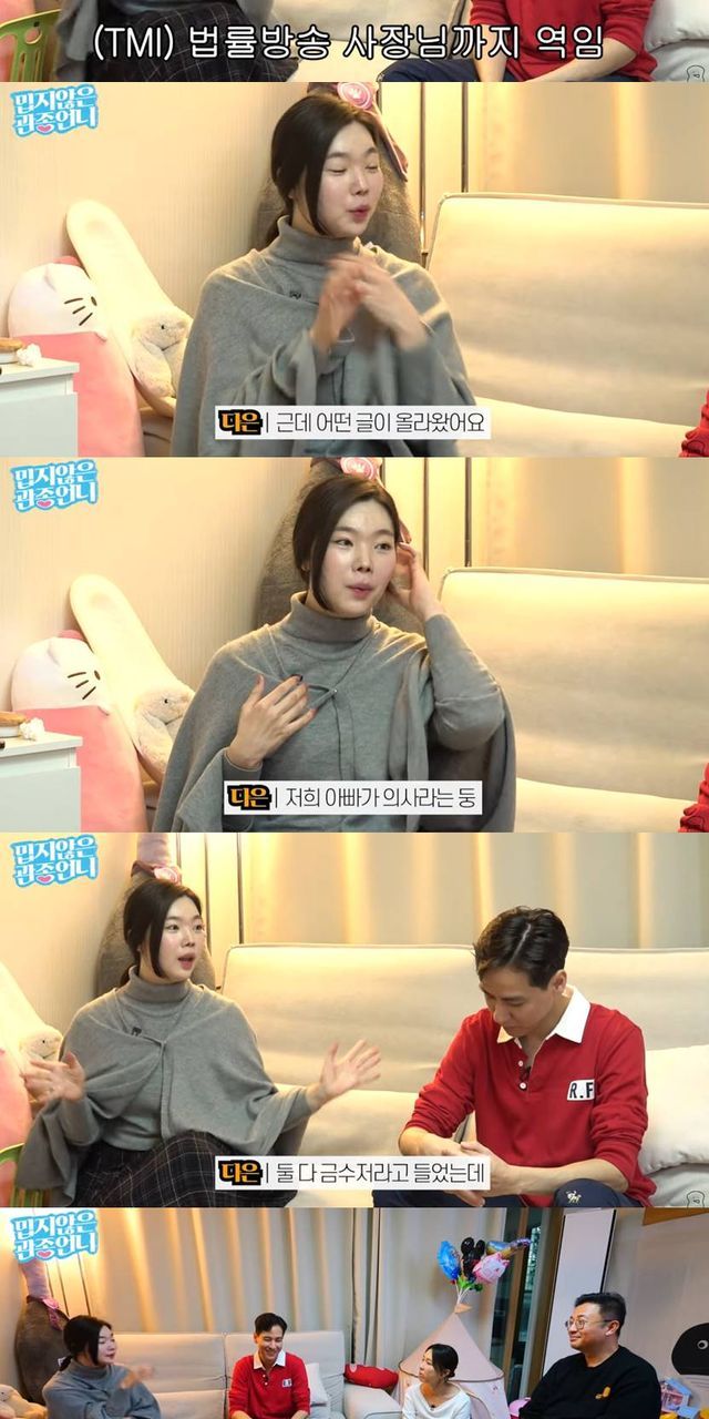 이날 공개된 영상에서 이지혜는 윤남기의 금수저 소문에 대해 물었다. 이에 이다은은 "오빠가 직접 말하기 좀 그러니까 제가 대신 말하겠다"라며 "타워팰리스에 살았다는 썰이 있는데 그건 맞다. 그리고 아버님이 '한국일보' 사장이라는 말이 있는데 그것도 맞다. 법률 방송 사장님까지도 하셨다"고 밝혀 놀라움을 안겼다.