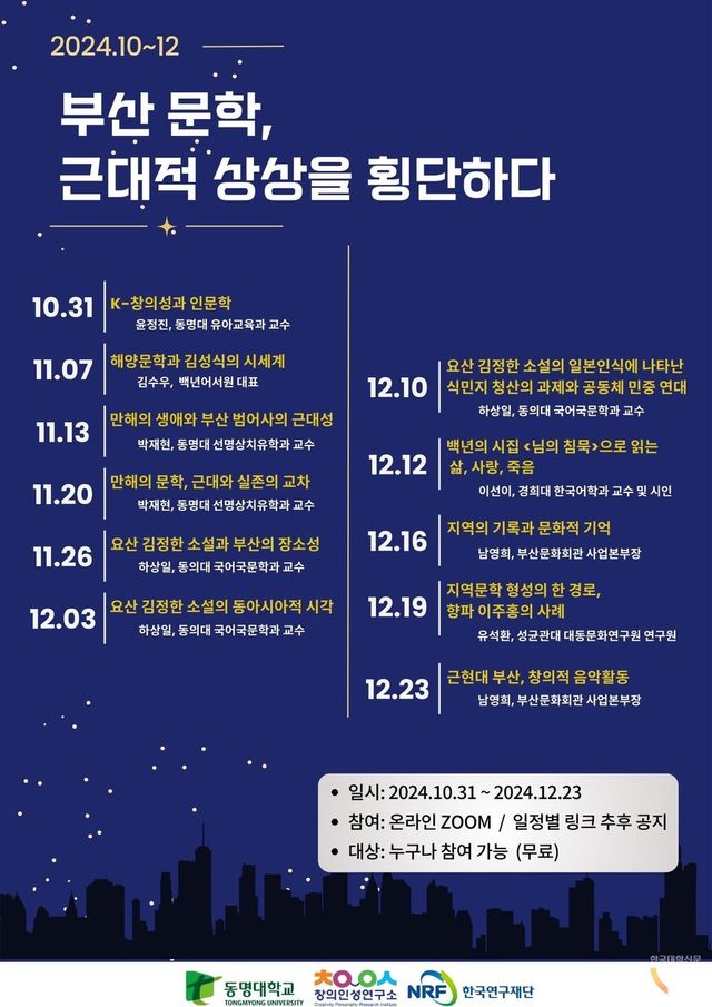 [한국대학신문 이정환 기자] 동명대 창의·인성연구소가 ‘부산 문학, 근대적 상상을 횡단하다’를 주제로 한 지역중심 인문포럼을 오는 12월 23일까지 모두 11차례에 걸쳐 무료로 운영한다. 10월 31일 ‘K-창의성과 인문학’ 강좌(윤정진 교수. 동명대 유아교육과)를 시작으로, 개별 강좌는 온라인(ZOOM)으로 운영된다.
