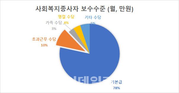 1일 보건복지부가 2023년 사회복지종사자 보수수준 및 근로여건 실태조사를 진행한 결과 기본급은 247만 4000원(78.4%), 수당 등은 68만 3000원(21.6%)으로 조사됐다. 2020년 실태조사 대비 5.5% 증가했다. 월평균 근로시간은 이전 조사(175.3시간) 대비해 소폭 감소한 171.7시간이었다. 비정규직과 이직의사의 비율은 소폭 상승하여 근무환경의 지속적 개선이 필요한 것으로 나타났다.