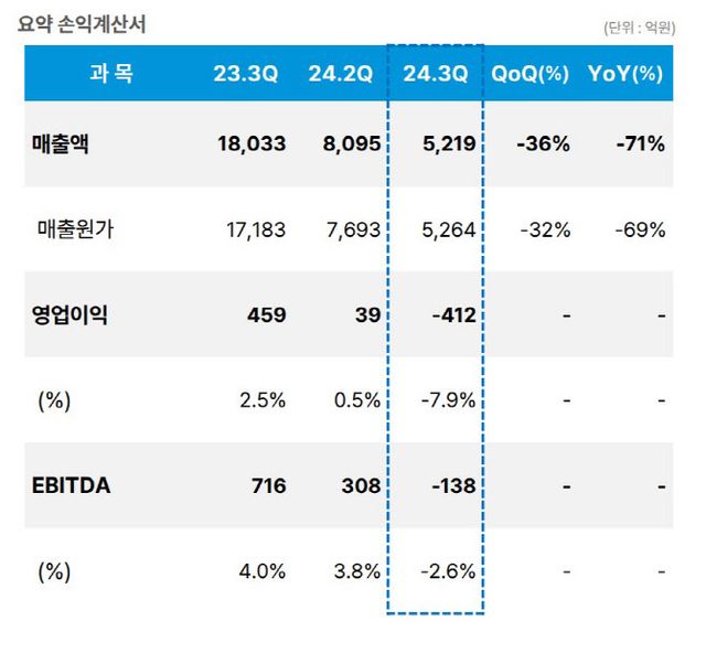 에코프로(086520)는 올해 3분기 연결기준 실적으로 매출 5943억원, 영업손실 1088억원을 기록했다고 1일 밝혔다. 매출은 전년 동기 대비 68.8% 감소했으며 지난해 4분기 이후 4개 분기 연속 적자를 이어갔다. 적자 규모는 전분기(546억원) 대비 2배가량 증가했다.