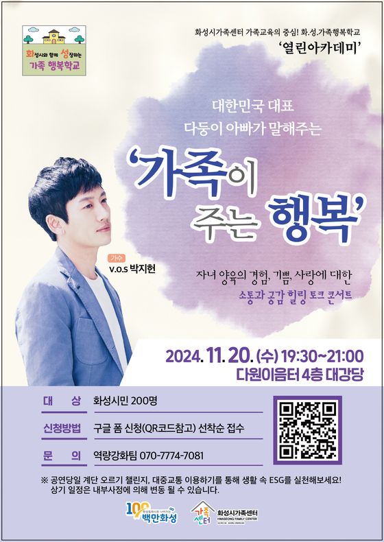 화성시가족센터가오는20일다원이음터대강당에서화.성.가족행복학교열린아카데미‘가수V.O.S박지헌이말해주는가족이주는행복’을개최한다.