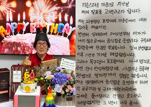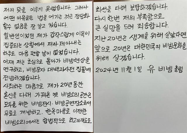 죄송스러운 마음으로 지난날 저의 잘못을 고백하고자 합니다. 저는 과일 행상, 포장마차, 미용실까지 여러 장사를 해왔지만, 번번이 실패하여 2003년부터 허가가 나지 않은 곳에서 음식점을 운영하다 구속돼 집행유예 판결을 받았습니다. 깊이 반성했고, 이후 1년간 가게를 폐업했습니다. 그러나 목구멍이 포도청이라 아내 명의로 공연전시한식체험장 사업자로 등록해 편법으로 얼마 전까지 영업을 했습니다. 저는 떳떳하게 음식점을 운영하기 위해 각 공공기관 및 규제개혁위원회에 규제를 풀어 달라고 간절히 호소하고 매달렸지만 그 벽이 너무 높아 저의 뜻을 이루지 못했습니다. 그러나 어떤 이유로든 법을 어기는 것은 정당화할 수 없음을 잘 알고 있습니다. 일반인이었던 제가 갑작스럽게 이목이 집중되는 상황에서 저와 제 아내는 하루도 마음 편할 날이 없었습니다. 이제 저는 초심으로 돌아가 비빔현상을 연구하고, 비빔문자 대백과사전 집필에 전념하겠습니다. 사죄하는 마음으로 제가 20년 동안 혼신을 다해 가꿔온 옛 비빔소리 공간은 모두를 위한 비빔전시, 비빔공연 장소로서 무료로 개방하고, 한옥마을로 이전한 비빔소리에서는 합법적으로 최고의 재료로 최선을 다해 보답하겠습니다. 다시 한번 저의 부족함으로 큰 실망을 드려 죄송합니다. 지난 20년은 생계를 위해 살았다면, 앞으로 20년은 대한민국의 비빔문화를 위해 살겠습니다.