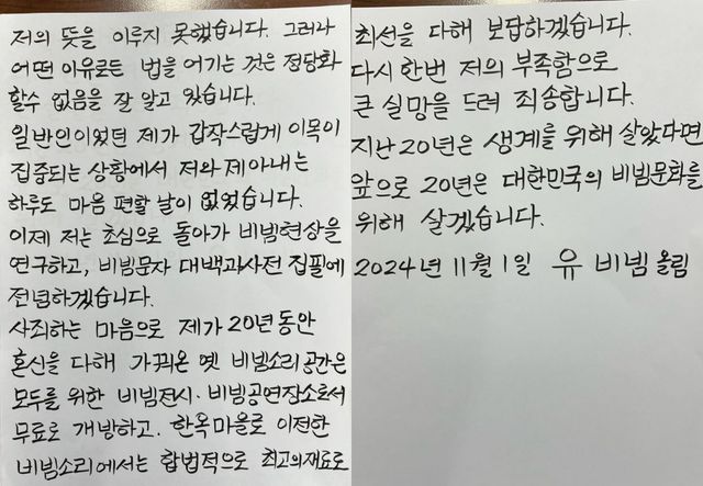 이제 저는 초심으로 돌아가 비빔현상을 연구하고, 비빔문자 대백과사전 집필에 전념하겠습니다. 사죄하는 마음으로 제가 20년 동안 혼신을 다해 가꿔온 옛 비빔소리 공간은 모두를 위한 비빔전시, 비빔공연 장소로서 무료로 개방하고, 한옥마을로 이전한 비빔소리에서는 합법적으로 최고의 재료로 최선을 다해 보답하겠습니다.