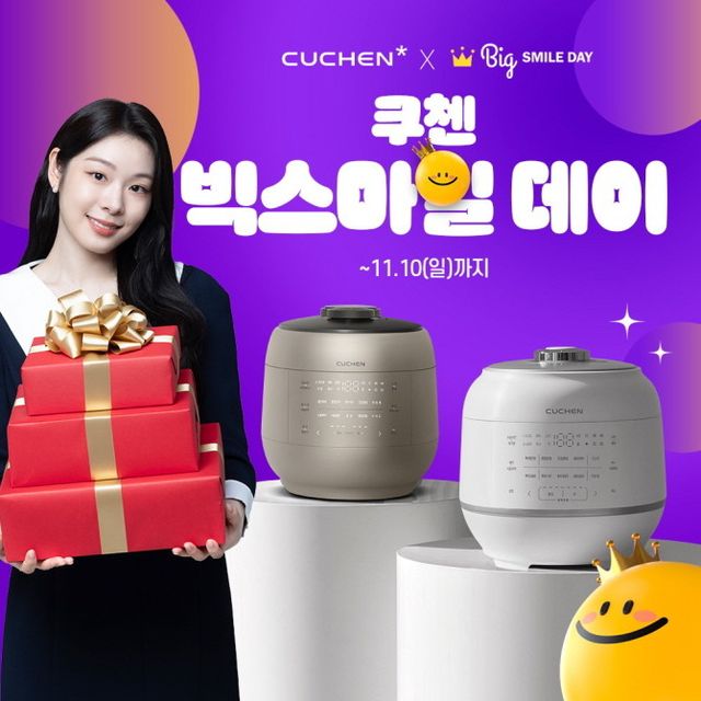 '빅스마일데이'는 G마켓과 옥션이 공동 진행하는 연중 최대 할인 행사다. 쿠첸은 행사 기간 동안 단독 브랜드관을 열고 빅스마일데이 10% 할인 쿠폰에 중복 사용이 가능한 브랜드 전용 최대 15% 할인 쿠폰, 카드사 7% 할인 등의 혜택을 추가로 제공한다.