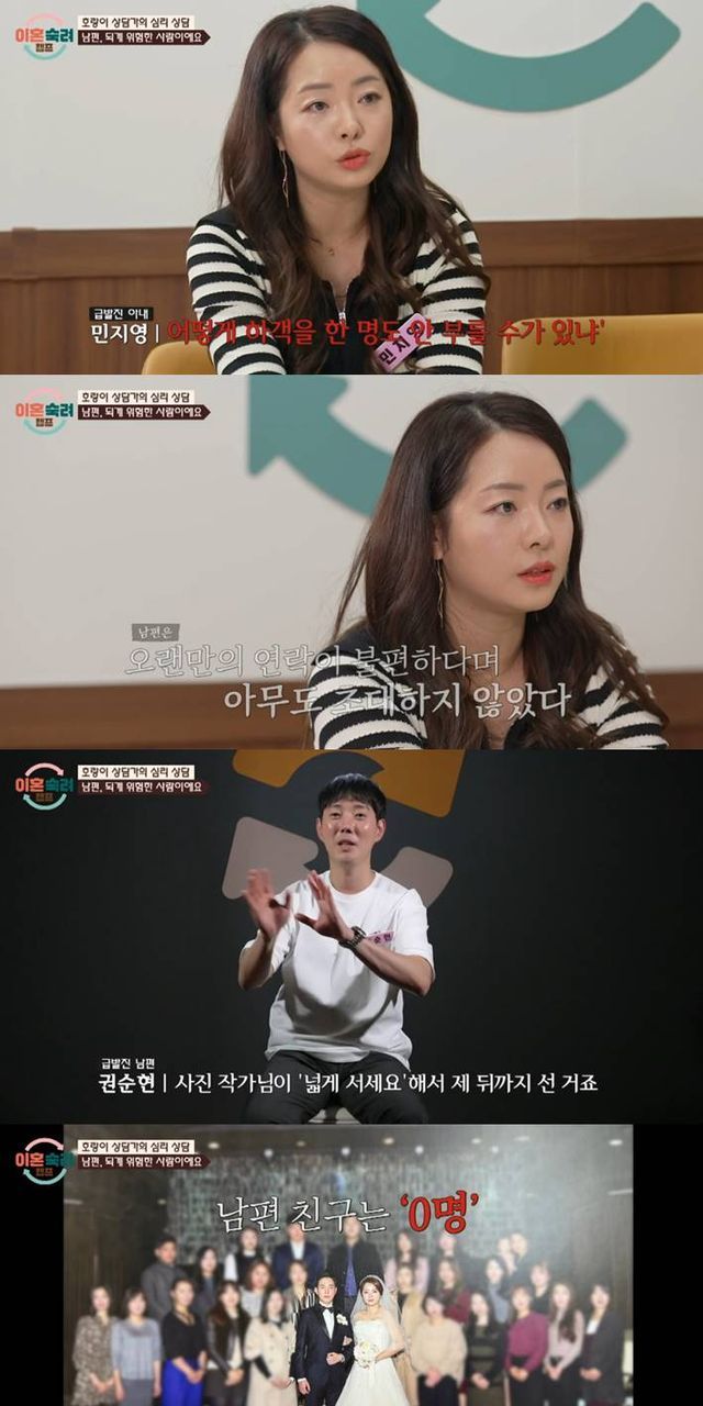 심리상담가는 "이거 책임져야 한다. 이거 굉장한 거다. 모든 걸 다 포기하고 온 거다"라며 "남편 주변에 누가 있냐"라고 질문했다.