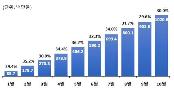 농식품부는 연말까지 수출액이 12억 달러에 이를 것으로 전망했다.