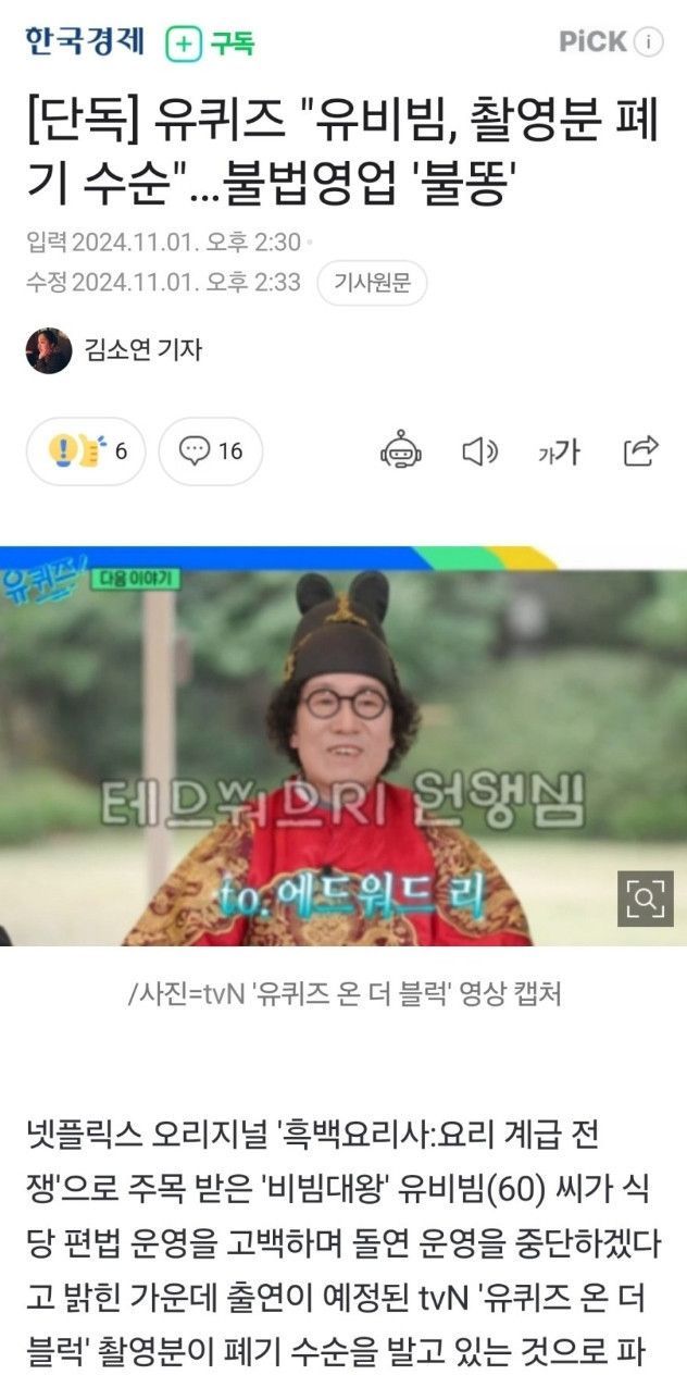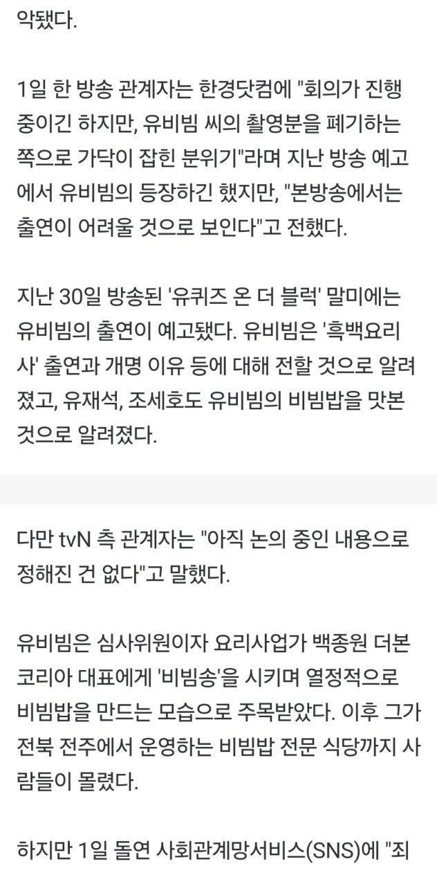 유퀴즈 "유비빔, 촬영분 폐기 수순"