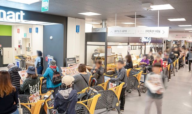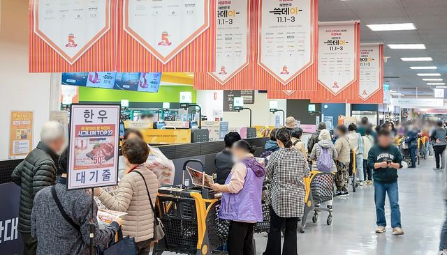 이마트 '쓱데이' 행사가 시작된 1일 서울 용산구 이마트 용산점에서 고객들이 결제를 기다리며 길게 줄을 서고 있다. / 이마트 제공