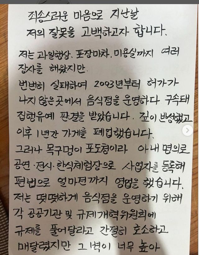 이어 판결 후에도 아내 명의로 공연전시한식체험장으로 사업자를 등록해 편법 영업을 했다고 자백하며 "얼마 전까지 영업을 했다. 저는 떳떳하게 음식점을 운영하기 위해 각 공공기관 및 규제개혁위원회에 규제를 풀어 달라고 간절히 호소하고 매달렸지만 그 벽이 너무 높아 저의 뜻을 이루지 못했다"고 전했다.