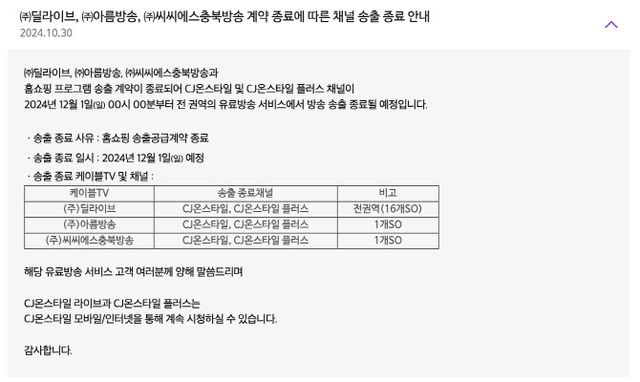CJ온스타일은 1일 홈페이지를 통해 CJ온스타일 및 CJ온스타일 플러스 채널이 오는 12월 1일 0시부터 이들 3개 케이블 TV 사업자 전 권역에서 방송 송출이 종료될 예정이라고 밝혔다.