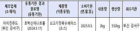 식품의약품안전처(처장 오유경)는 식품제조·가공업체인 ‘아이진푸드(부산 강서구 소재)’가 유통기한이 경과된 원료를 사용해 ‘쇠고기맛육수베이스(식품유형: 소스)’를 제조․판매한 사실이 확인되어 해당 제품을 판매 중단 및 회수 조치한다고 밝혔다.