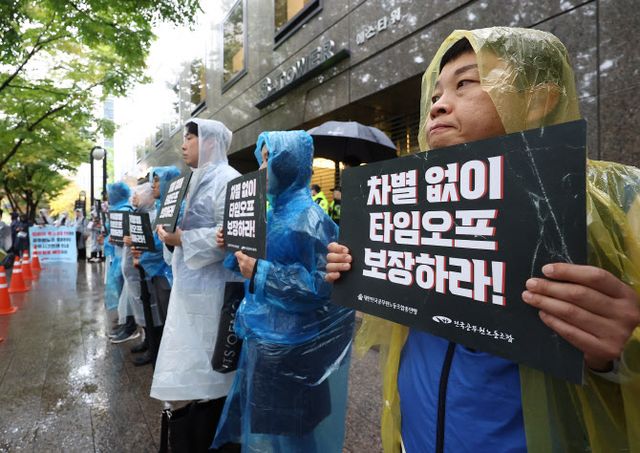 타임오프는 노사가 공동으로 인정한 노조 전임활동을 유급으로 보장하는 제도다. 노동조합법에 따라 유급 노조활동 가능 시간(타임오프 한도)이 조합원 규모에 비례해 정해지는데, 한도를 초과한 유급활동을 하거나 노조 전임자를 두면 사용자의 ‘부당노동행위’가 된다.