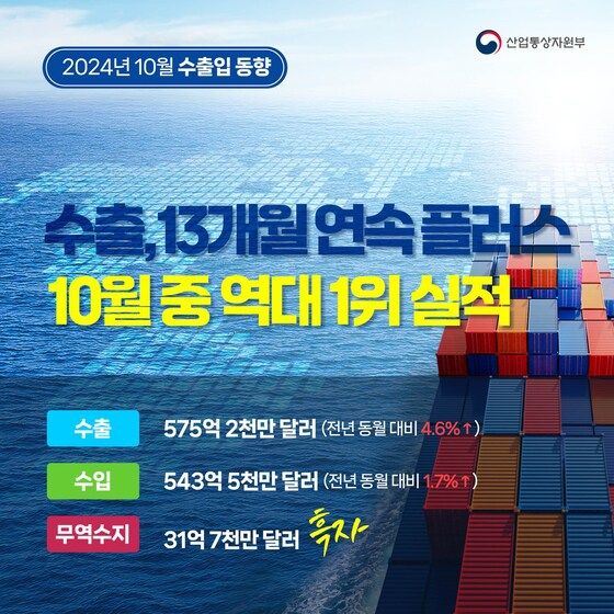 지난달 수출은 역대 10월 중1위인 575억 2000만달러로, 지난 8월부터 3개월 잇달아 월별 최대실적을 경신하면서 13개월 연속 플러스 흐름을 이어갔다.무역수지도 31억 7000만 달러 흑자로 17개월 연속 흑자를 기록했다.