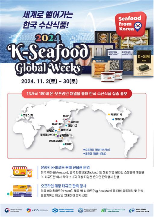 이러한 노력에 따라 K-수산물의 해외 시장을 대상으로 한 행사도 열린다. 해수부는 중국 광군제(11월 11일), 미국 블랙프라이데이(11월 29일) 등 주요 국가들의 세일 행사 주간에 맞춰 오는 30일까지 ‘2024 한국 수산식품 홍보주간’을 진행한다. 미국과 중국, 베트남, 호주 등 13개국 180개 온·오프라인 유통채널에서 우리 수산식품을 집중 홍보한다는 계획이다.