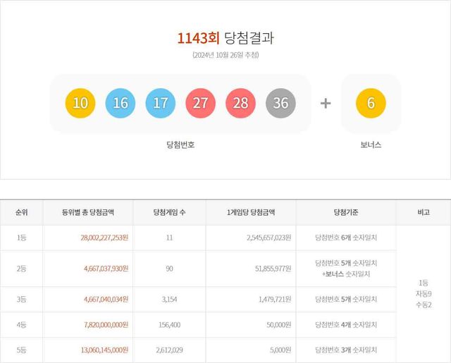 10월 26일 추첨 된 1143회 1등 당첨번호는 '10, 16, 17, 27, 28, 36' 보너스 번호는 '6' 번이다.