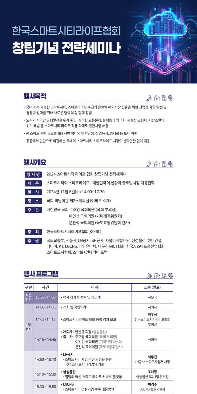 국내 스마트시티 및 스마트라이프 산업의 융합과 발전, 그리고 글로벌 경쟁력 강화를 위한 협력의 장을 마련하고자 한국 스마트시티 라이프 협회 창립 기념 전략 세미나를 개최합니다.
