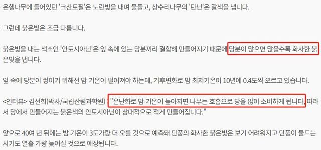 밤에 기온이 높아서 빨간색을 내는 당을 호흡으로 다 써버림