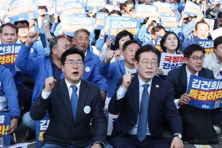 이날 거리에 나온 이 대표는 연설을 통해 “대통령실은 온 국민이 대통령의 육성을 들었는데도 또 국민을 속이려 한다”면서 “‘둘 맞을 각오로 버티’는 것은 진리를 찾는 구도자에게 어울려도, 국민의 공복인 대통령에게 어울리지 않는다”고 말했다.