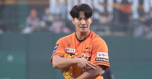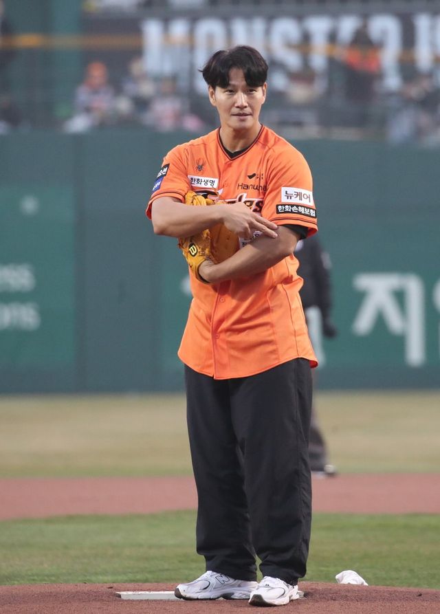 김종국이 지난 3월 29일 대전 중구 한화생명 이글스파크에서 열린 '2024 신한 SOL 뱅크 KBO리그' kt 위즈와 한화 이글스 경기에서 시구에 앞서 사인을 보내고 있다. / 뉴스1