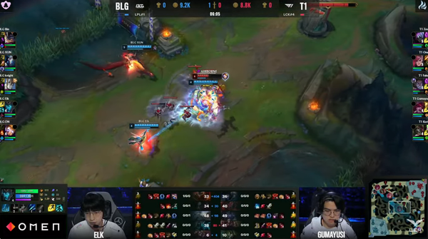 T1은 탑에서 마지막 승부수를 던진다. 홀로있는 나이트 갈리오를 확인한 뒤 궁극기를 쏟아내 상대를 압박한다. BLG는 럼블이 합류하며 맞불을 놓는다. 그러나 갈리오를 사냥할만한 화력이 나오지 않는 솽황. 결국 BLG가 킬을 쓸어담은 뒤 바론을 사냥하면서 골드 차이를 1만으로 벌린다.
