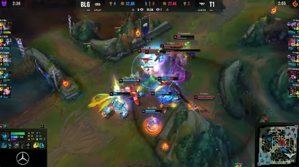 이후 BLG는 미드를 뚫은 뒤, 바텀을 파면서 교전에 나섰다. T1은 자신들의 조합을 활용해 상대를 받아쳐 2:2 교환으로 1차 공세를 막는다. 그러나 2차 공세에서 결국 골드 차이를 극복하지 못하고 경기를 내주고야 만다.