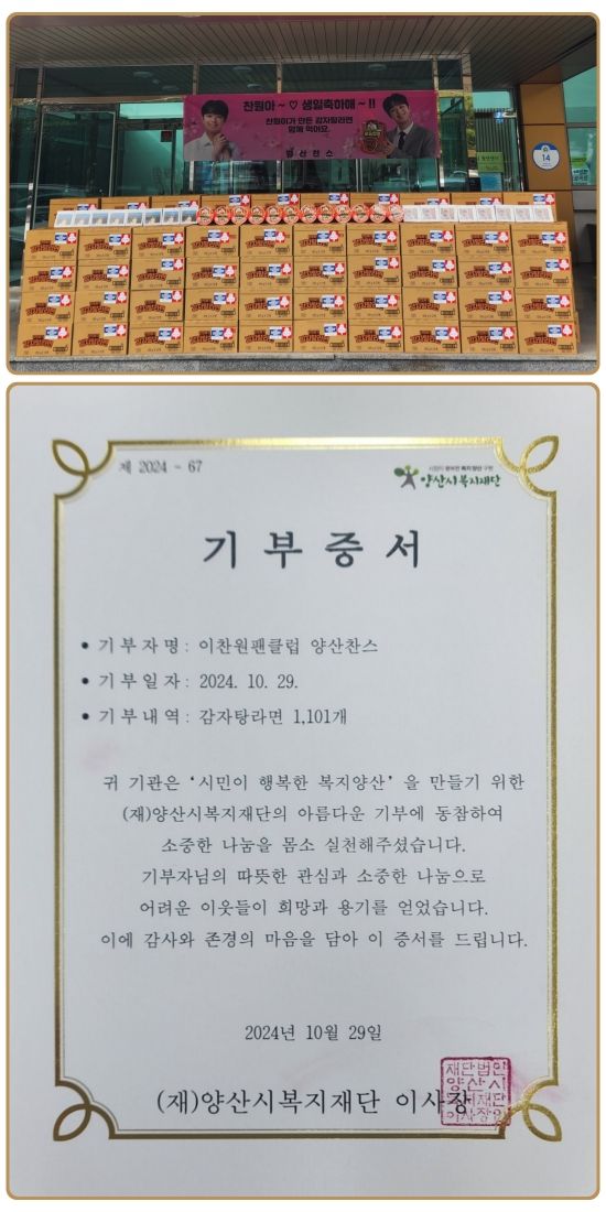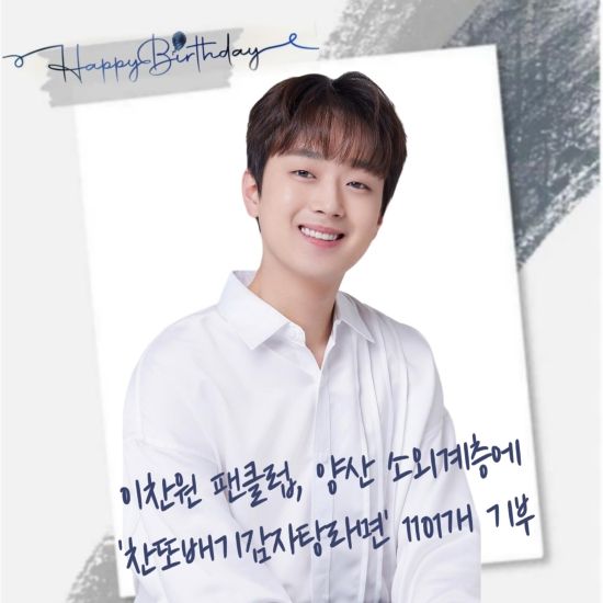 이찬원 팬클럽 '양산 찬스'는 10월 29일 이찬원의 생일(11월 1일)을 기념해 경남 양산시복지재단을 방문해 '찬또배기 감자탕라면' 1,101개를 후원했다고 밝혔다.